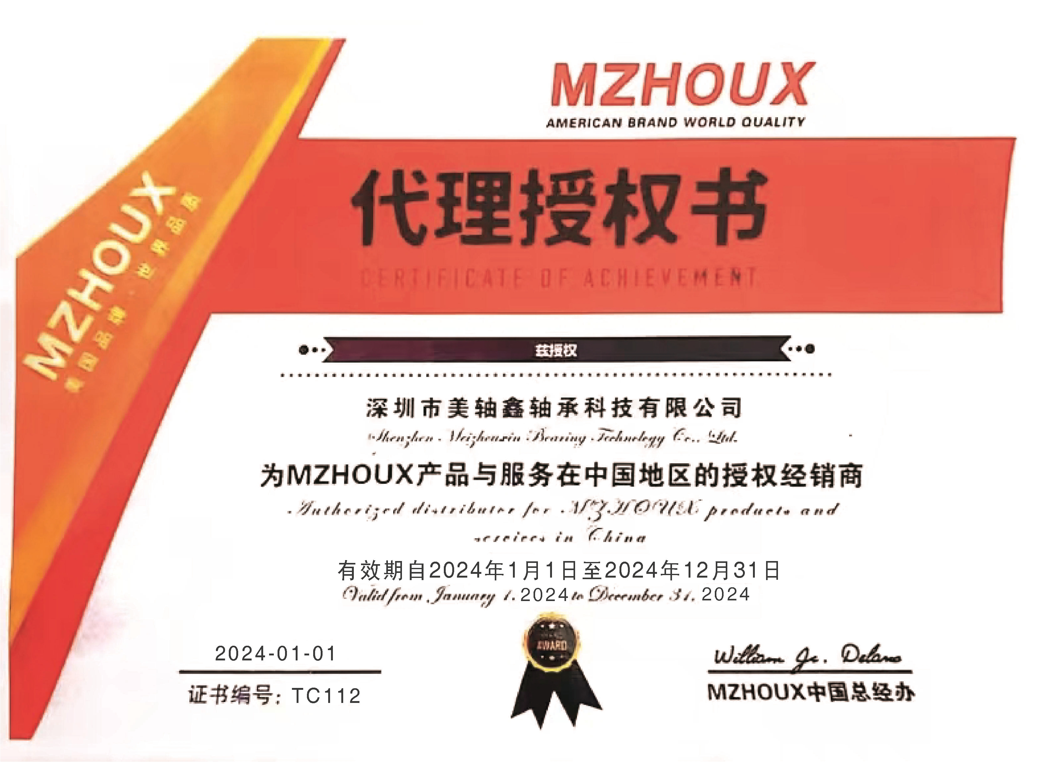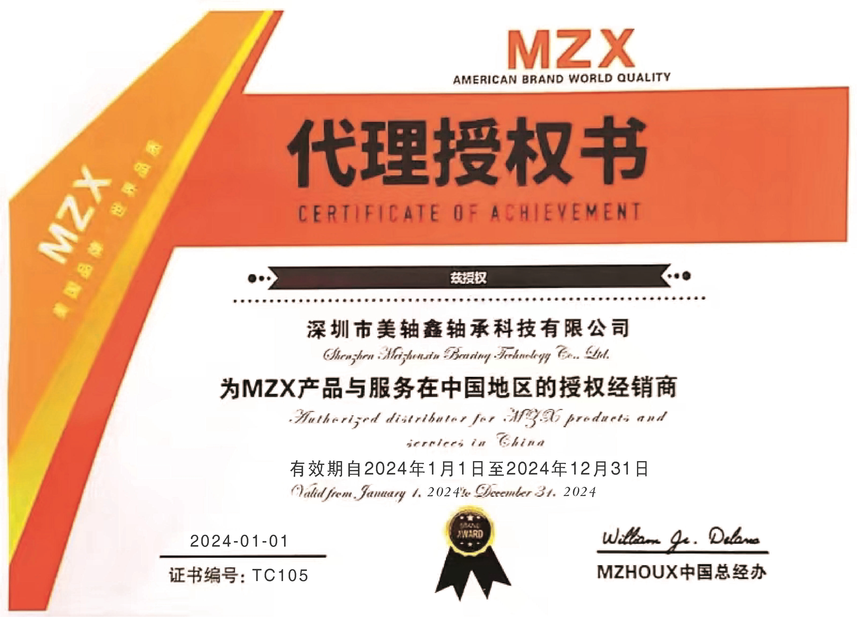 2024年MZHOUX授權(quán)證書